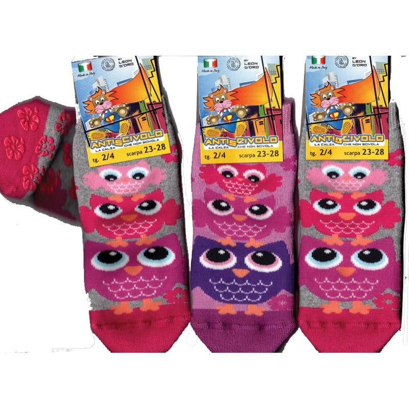 6 paia antiscivolo bimba in caldo cotone elasticizzato rasato, lavorato in graziose fantasie. Soffice interno spugnone. Morbido polsino elastico a costina. ABS colorati sulla pianta del piede.