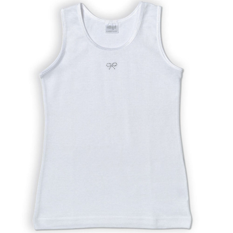 3 top bimba spalla larga, in 100% puro cotone pettinato lavorato a costina liscia, tinta unita, con graziosa, piccola applicazione in strass. Capo fresco, leggero, anallergico, disponibile nel colore bianco nelle taglie 3 (98 cm.), 4 (104 cm.), 5 (110 cm).