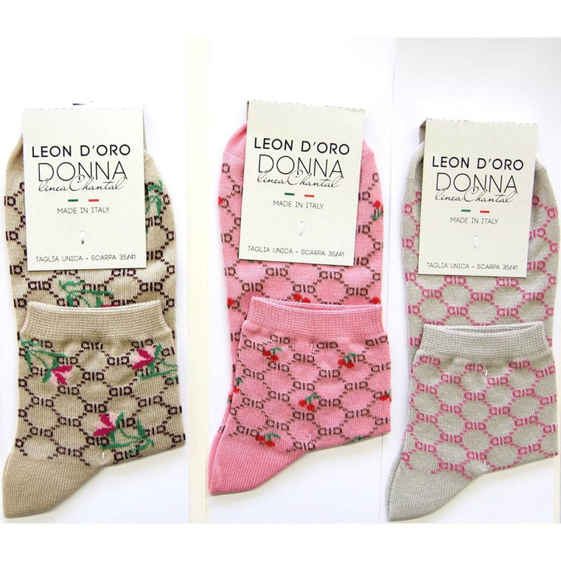 6 paia calza donna corta in filo di Scozia elasticizzato rasato, lavorato in fantasia geometrica e fiori o piccoli frutti. Morbido polsino elastico a costina