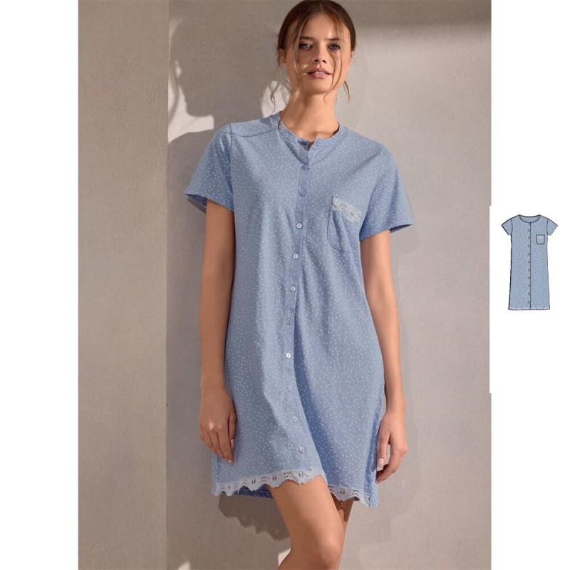 Camicia da notte donna manica corta, aperta, in cotone stampato a pois, con delicato pizzo elasticizzato al bordo e al taschino laterale cucito