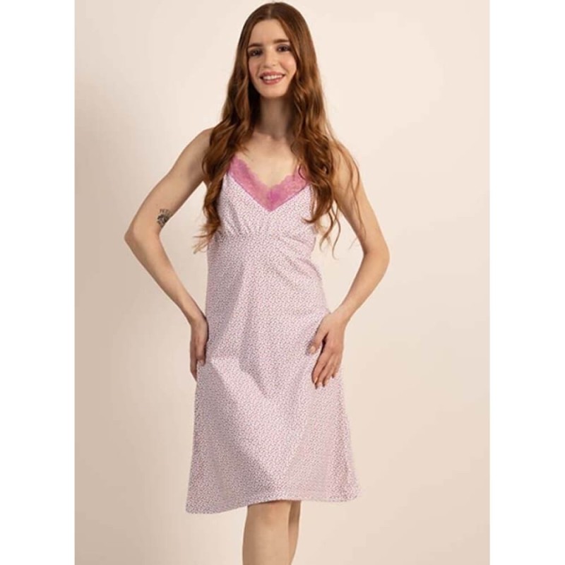 Camicia da notte donna in cotone stampato a pois. Pettorina tagliata, leggermente arricciata. Scollo a V con delicato pizzo elasticizzato. Comode spalline elastiche regolabili