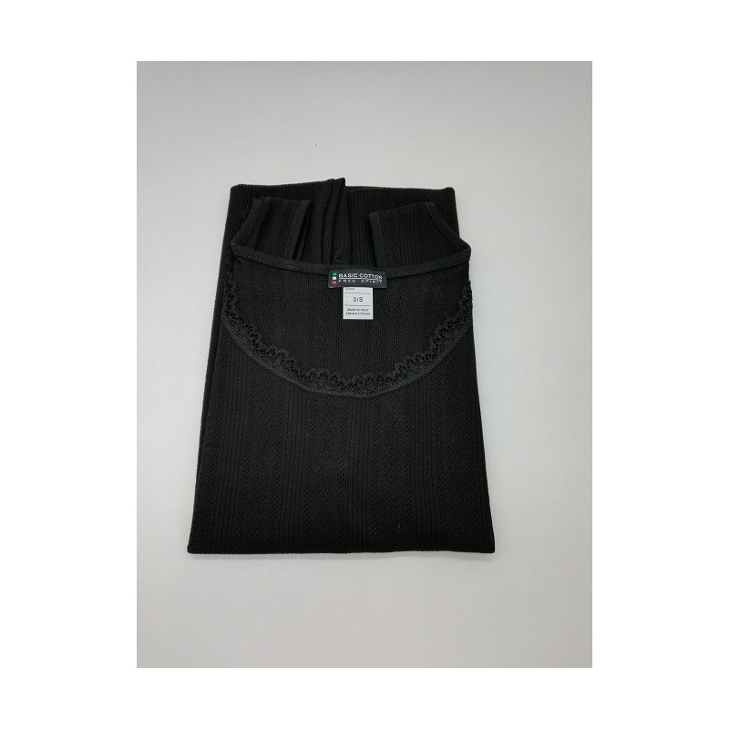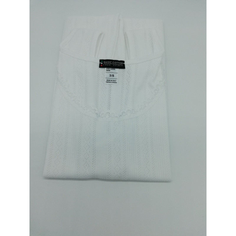 Top donna spalla larga in puro cotone tinta unita leggermente traforato. Scollo tondo impreziosito da un delicato piccolo pizzo. Disponibile nei colori cipria rosa, bianco e nero dalla taglia 3/S alla 6/XL. Qualità e stile Made in Italy