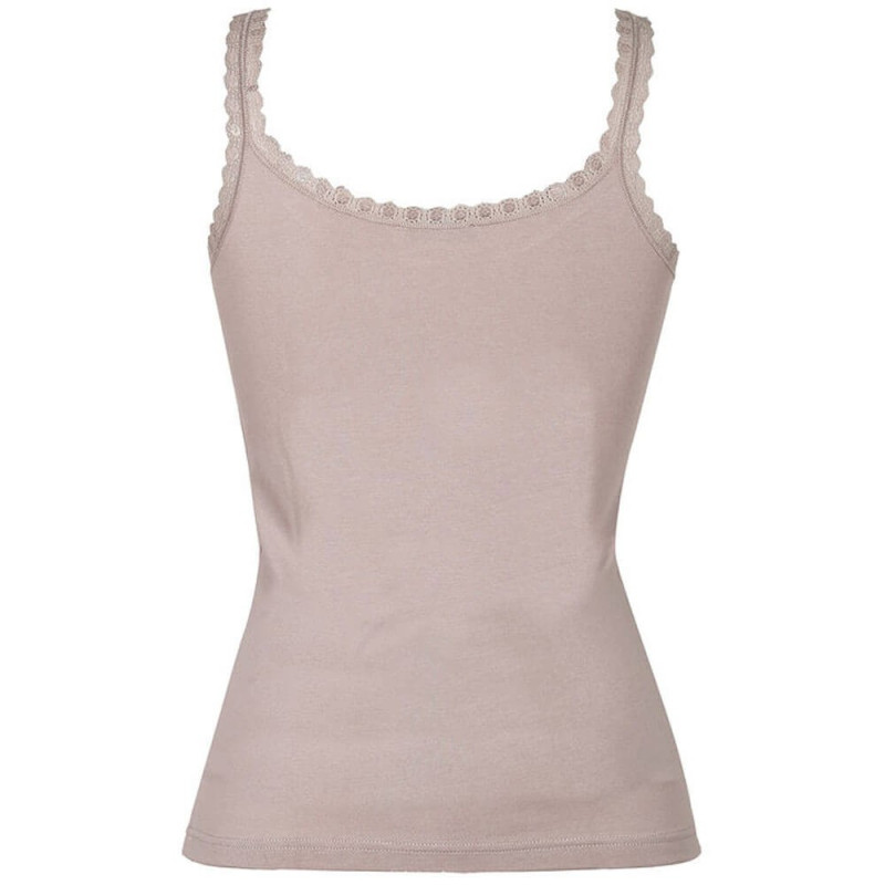 Top donna in cotone modal elasticizzato, rasato, tinta unita. Spalline in delicato pizzo elasticizzato, come il profilo dello scollo e degli scavi. Disponibile nei colori sabbia e rosa nelle taglie 3/S - 4/M - 5/L