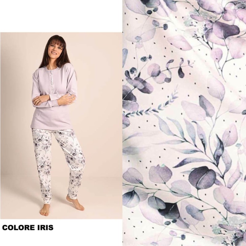 Pigiama donna in caldo cotone interlock. Maglia diritta, tinta unita, con morbidi polsini alle maniche. Apertura a serafino 5 bottoni, con profilo stampato. Scollo tondo. Pantalone stampato in fantasia di foglie e fiori, con morbido elastico coperto in vita e polsini alle caviglie. Disponibile nei colori lillà iris e rosa antico polvere dalla taglia M alla XXL. Qualità e stile Made in Italy