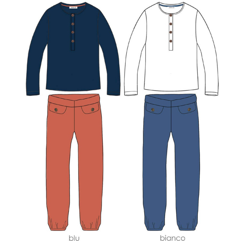 Pigiama donna in cotone. Maglia in morbido cotone modal, diritta, tinta unita, con polsini bassi alle maniche. Apertura a serafino 4 bottoni, scollo tondo profilo basso. Pantalone in 100% puro cotone tinta unita con morbido elastico alto coperto in vita, finti taschini cuciti in vita e morbido elastico basso coperto alle caviglie. Disponibile nel colore blu nelle taglie S - M - L