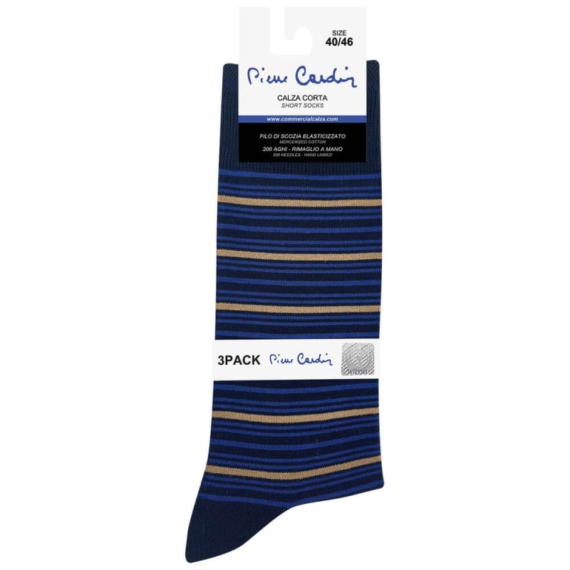 12 paia calza uomo corta in pregiato filo di Scozia elasticizzato rasato, lavorato a righe orizzontali. Morbido polsino elastico a costina. Confezione assortita in differenti colori e lavorazioni disponibile in taglia unica 40/46.