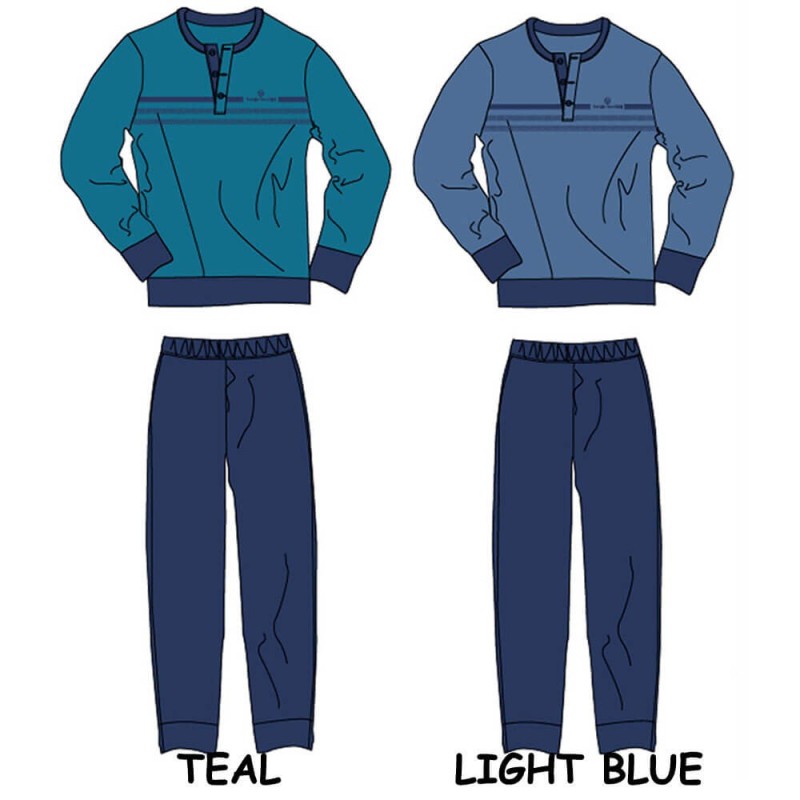 Pigiama uomo in cotone. Maglia tinta unita con motivo a righe orizzontali e piccolo logo stampati nella parte alta. Apertura a serafino 3 bottoni con profilo interno in colore in contrasto, come il profilo dello scollo tondo ed i morbidi polsini al bordo e alle maniche. Pantalone tinta unita con morbido elastico coperto in vita, taschino cucito dietro e polsini alle caviglie. Disponibile nei colori petrolio teal e celestone light blue dalla taglia M alla XXL