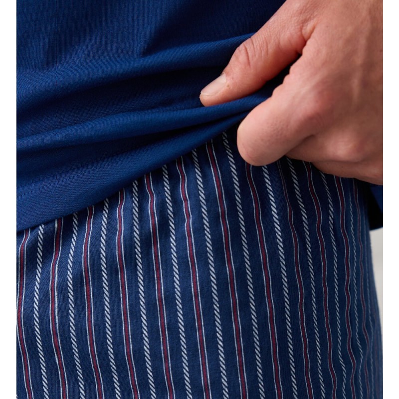 Pigiama uomo in cotone. Maglia diritta, tinta unita con logo stampato laterale alto. Apertura a serafino 3 bottoni con profilo interno in colore in contrasto, collo Levis. Pantalone diritto, stampato a righe verticali differenziate, con morbido elastico coperto in vita e taschino cucito dietro. Disponibile nei colori blu e denim dalla taglia M/48 alla XXL/54