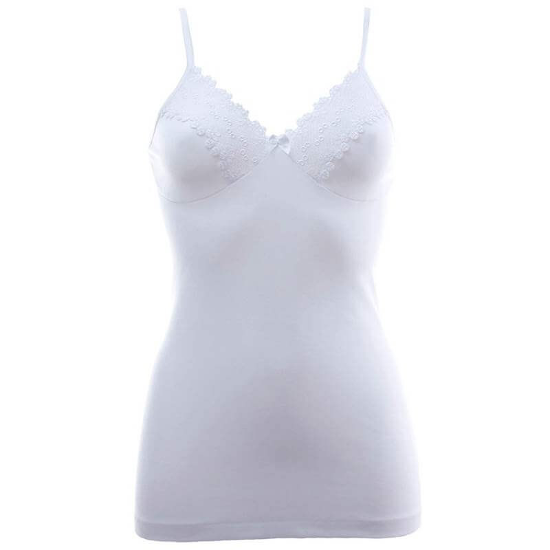 Top donna taglie forti in 100% puro cotone filo di Scozia, fresco e leggero, con spalline strette, forma del seno e preziosi ricamo in pizzo macramè applicato allo scollo. Ottima vestibilità. Disponibile nei colori bianco e nero in taglia comoda 8. Qualità e stile Made in Italy