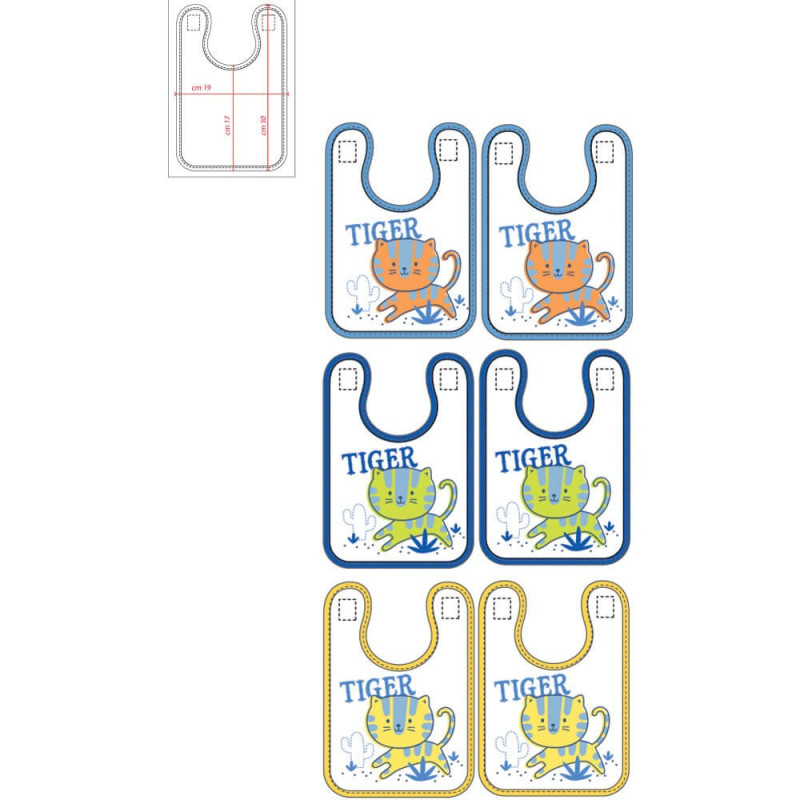 6 bavaglino baby cm. 19x30 in spugna di cotone plastificata, con graziosa stampa centrale su fondo bianco. Profilo in cotone colorato. Comoda chiusura con velcro