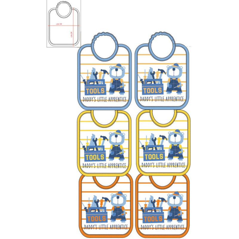 6 bavaglini baby cm. 19x24 in spugna di cotone plastificata, con simpatica stampa. Comoda chiusura elastica ad anello e profilo in cotone tinta unita colorato. Confezione assortita in 3 differenti colorazioni