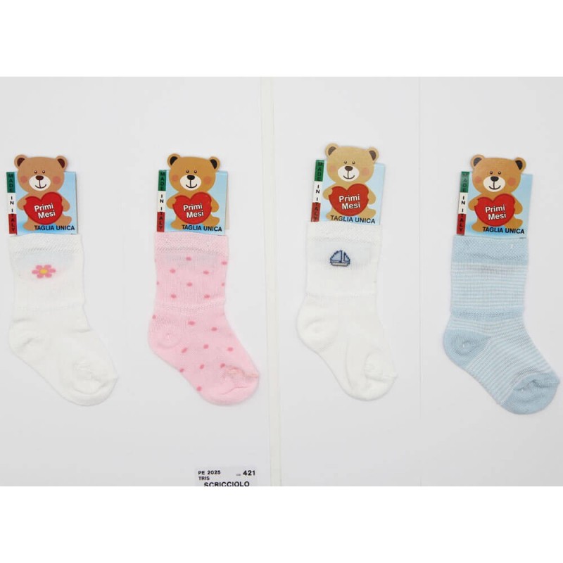 6 paia calza baby primi mesi corta in cotone elasticizzato leggermente traforato grazie ad una delicata lavorazione in filo. Morbido polsino elastico a nido d' ape