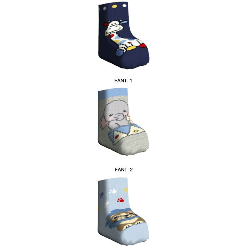 12 paia calza baby corta in caldo cotone elasticizzato rasato, lavorato in graziose fantasie. Morbido interno spugnone. Polsino elastico basso a costina