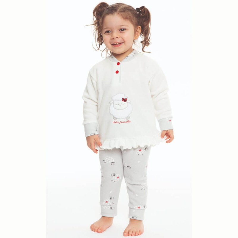 Pigiama baby in caldo punto Milano. Maglia tinta unita con graziosa applicazione e ricami centrali. Vezzosa piccola balza leggermente arricciata al bordo. Apertura a serafino 2 bottoni, con profilo stampato, come il collo ed i morbidi polsini alle maniche. Comodo pantalone sagomato, stampato in piccola fantasia, con morbido elastico coperto in vita e polsini alle caviglie. Disponibile nelle taglie 12 e 30 mesi nel colore bianco latte. Qualità e stile Made in Italy