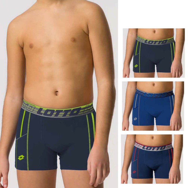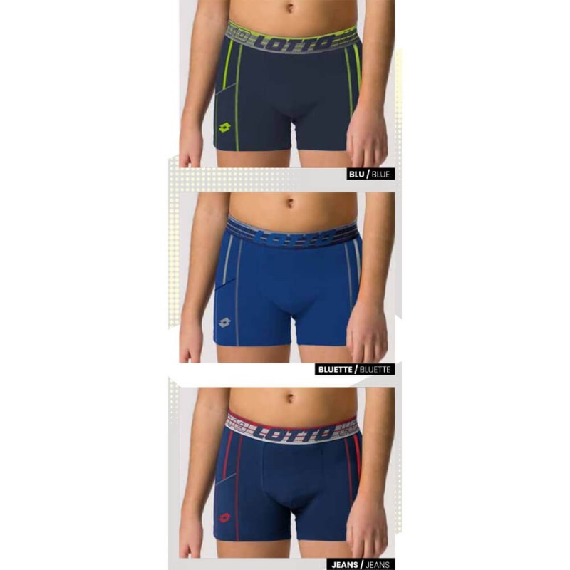 6 boxer ragazzo in cotone elasticizzato tinta unita con logo e piccolo motivo geometrico stampato su un fianco; banda verticale colorata cucita sull' altro fianco. Piccole cuciture a vista in filo in colore in contrasto. Morbido elastico esterno in vita con logo ricamati. Confezione assortita nei colori blu, bluette e jeans disponibile nelle taglie 11/12 - 13/14 - 15/16