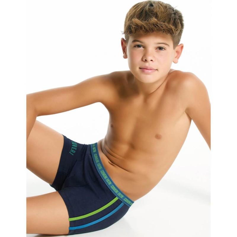6 boxer ragazzo in cotone elasticizzato con logo stampato e applicazioni colorate cucite. Morbido elastico esterno in vita con logo ricamati