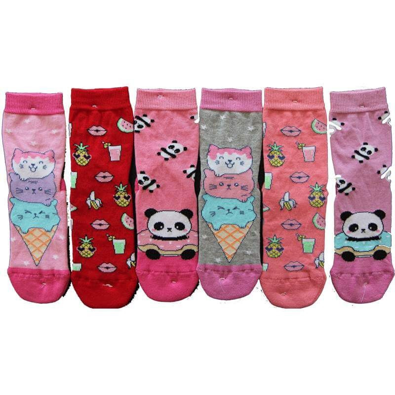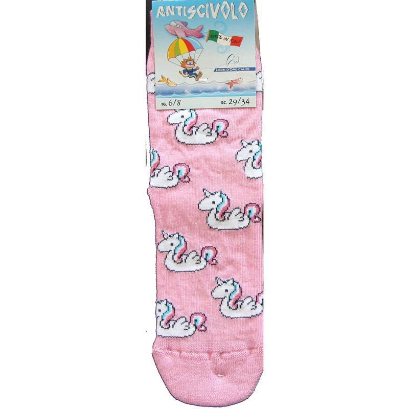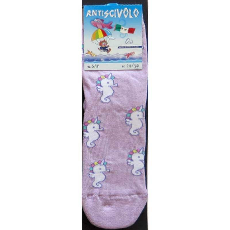 6 paia antiscivolo bimba in cotone elasticizzato rasato, lavorato in graziose fantasie assortite. Morbido polsino a costina. ABS in silicone colorato sulla pianta del piede