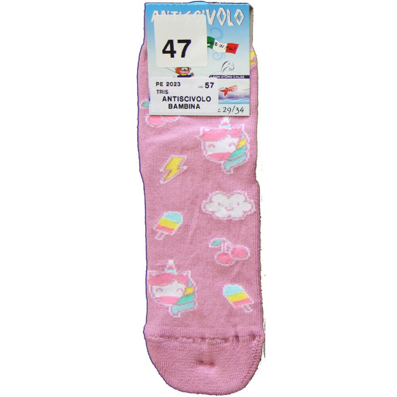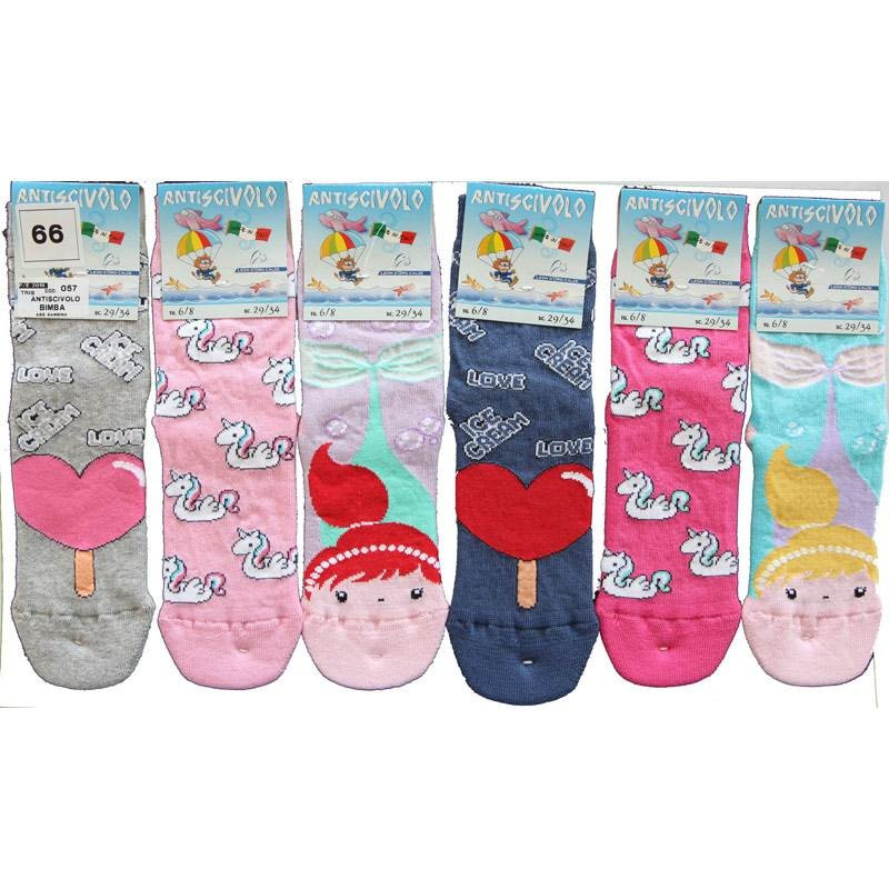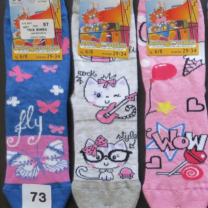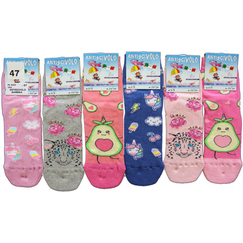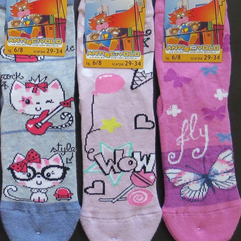 6 paia antiscivolo bimba in cotone elasticizzato rasato, lavorato in filo in graziose fantasie assortite. Morbido polsino elastico basso a costina. Sicuri ABS in silicone colorato sulla pianta del piede. Confezione assortita in colori e fantasie disponibile nelle taglie 2/4 (23/28) 6/8 (29/34) 10/12 (35/40). Qualità e stile Made in Italy
