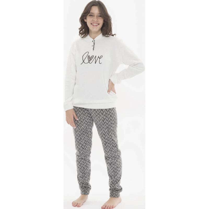 Pigiama ragazza in caldo punto Milano. Maglia tinta unita con stampa centrale e morbidi polsini al bordo e alle maniche. Apertura a serafino. Pantalone stampato, con polsini alle caviglie