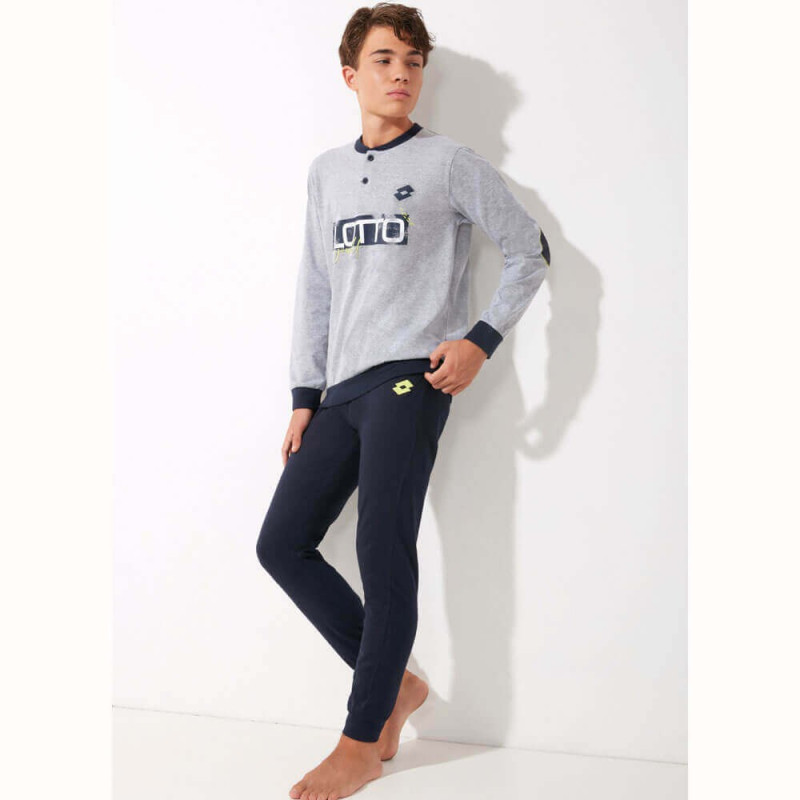 Pigiama ragazzo in cotone. Maglia tinta unita con logo centrale stampato e toppe in colore in contrasto stampate ai gomiti. Apertura a serafino, collo Levis a costina liscia in colore in contrasto, come i morbidi polsini al bordo e alle maniche. Pantalone tinta unita con piccolo logo in colore in contrasto stampato laterale, morbido elastico coperto in vita, taschino cucito dietro e polsini alle caviglie. Disponibile nei colori grigio melange e bluette nelle taglie 10 e 12