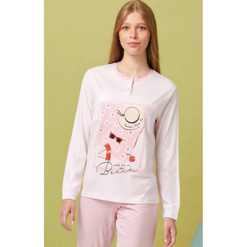 Pigiama ragazza in cotone. Maglia diritta, tinta unita con graziosa stampa centrale. Apertura a serafino 2 bottoni, scollo tondo profilo basso. Pantalone tinta unita con morbido elastico coperto in vita e polsini alle caviglie. Disponibile nei colori rosa e panna nelle taglie 11/12 - 13/14 - 15/16