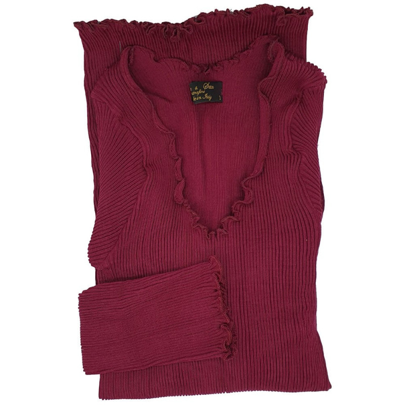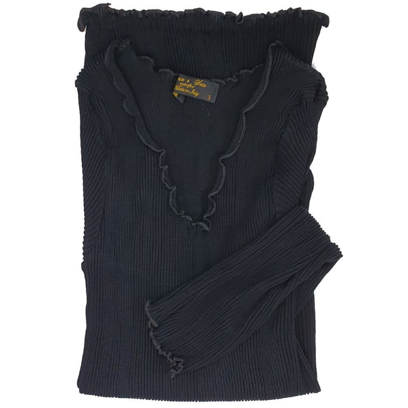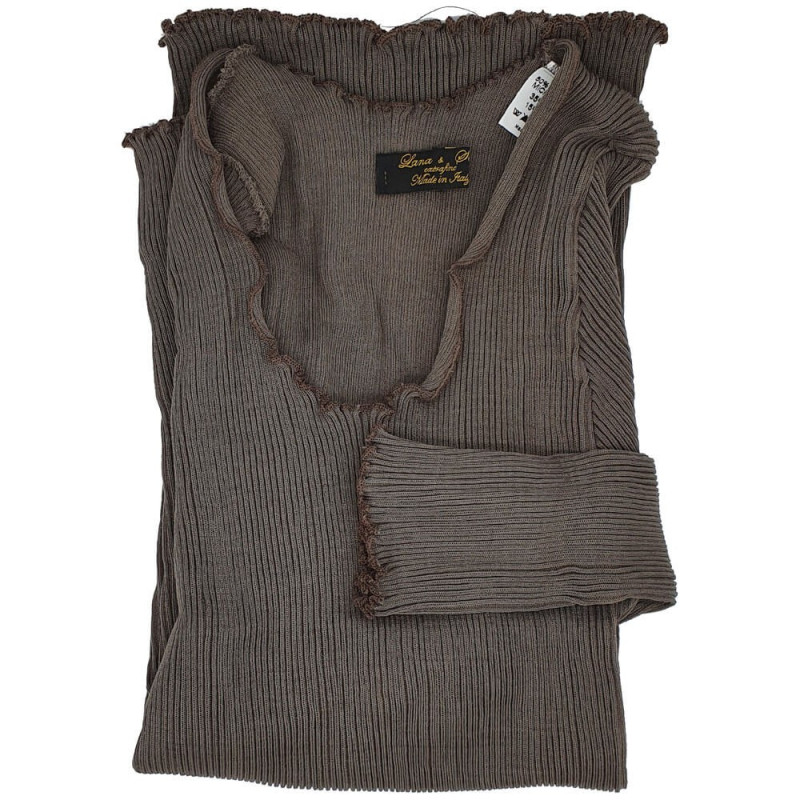 Maglia donna manica lunga in pregiata lana e seta tinta unita lavorata a costina. Scollo, polsi e bordo arricciati in filo