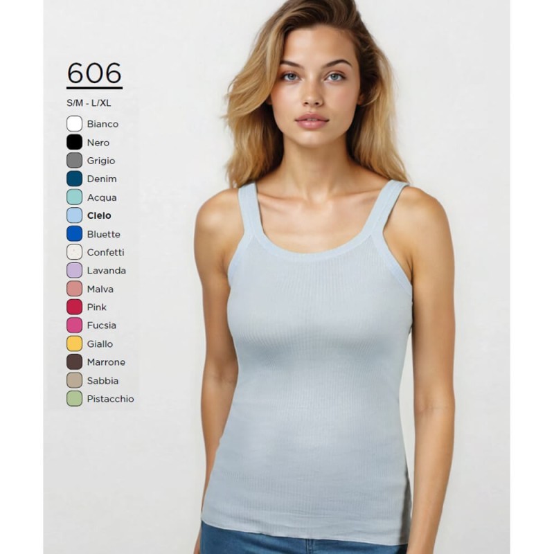 Canottiera donna in cotone tinta unita lavorato a costina. Bordi a costa larga e orlo leggermente arricciato