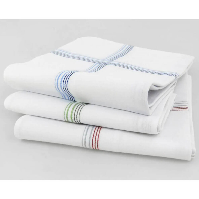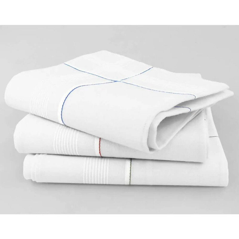 12 fazzoletti uomo cm. 44x44, in 100% puro cotone tinta unita con righe colorate in filo su fondo bianco. Confezione assortita in 3 differenti colorazioni. Verranno consegnate le varianti disponibili al momento dell' ordine
