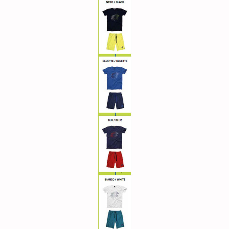 Completo uomo in cotone. Maglia manica corta, girocollo, tinta unita con logo centrale stampato. Pantalone corto tinta unita con piccolo logo stampato su una gamba, tasche laterali tagliate e morbido elastico coperto in vita con coulisse. Disponibile nei colori bianco, nero, blu e bluette nelle taglie M e XL